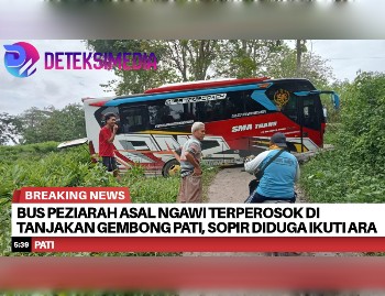 PATI, Deteksimedia.com – Sebuah bus pariwisata yang mengangkut rombongan peziarah asal Kabupaten Ngawi, Jawa Timur, mengalami insiden terperosok di tanjakan jalan Desa Plukaran, Kecamatan Gembong, Kabupaten Pati, pada Rabu (29/10/2025) dini hari sekitar pukul 02.00 WIB. Bus bernomor polisi AE 7621 UKI tersebut tidak kuat menanjak di jalur sempit dan licin hingga akhirnya terperosok ke pinggir jalan.