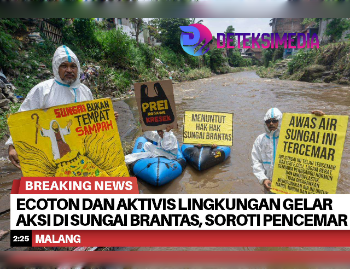 MALANG,Deteksimedia.com – Ecoton (Ecological Observation and Wetlands Conservation) bersama JEJAK (Jaringan Gen Z Jawa Timur Tolak Plastik Sekali Pakai) dan Komunitas Brantas Mboiz menggelar aksi lingkungan di Sungai Brantas, Kota Malang, sebagai bentuk protes terhadap pencemaran sungai yang semakin parah. Aksi ini bertujuan mendesak Pemerintah Kota (Pemkot) Malang untuk meningkatkan layanan pengelolaan sampah warga di Daerah Aliran Sungai (DAS) Brantas.