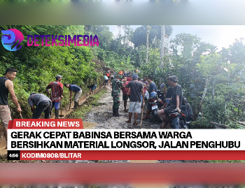 BLITAR, Deteksimedia.com – Pasca terjadi tanah longsor yang menutup akses jalan penghubung antara Dusun Sumbergondo dan Dusun Celeng. Babinsa Desa Tulungrejo Kecamatan Gandusari Kabupaten Blitar Pelda Slamet bersama aparat setempat bergerak cepat untuk melakukan gotong royong guna membersihkan material longsor, Minggu (2/11/2025).