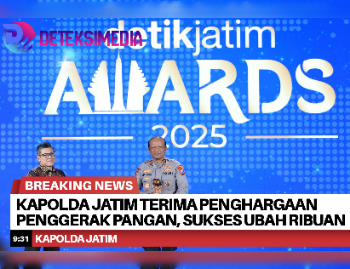 KOTA MALANG,Deteksimedia.com – Kapolda Jawa Timur Irjen Pol Drs Nanang Avianto,M.Si menerima Anugerah Figur Akselerator Kemajuan untuk kategori Penggerak Ketahanan Pangan di panggung detikJatim Awards 2025.