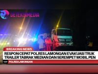 Respon Cepat Polres Lamongan Evakuasi Truk Trailer Tabrak Median dan Serempet Mobil Penumpang di JLU Barat