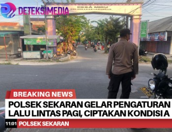 LAMONGAN,Deteksimedia.com – Polsek Sekaran melaksanakan kegiatan pengaturan lalu lintas (lalin) pagi di persimpangan jalan Desa Miru, Kecamatan Sekaran. Kegiatan ini bertujuan untuk menciptakan kondisi lalu lintas yang lancar, tertib, aman, dan kondusif di wilayah hukum Polsek Sekaran.